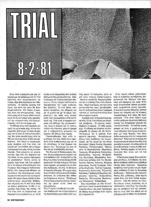 Είναι πολύ ευχάριστο για μας να αρχίσουμε να γράφουμε για το Trial έχοντας κάτι συγκεκριμένο να πούμε, έξω από ευχολόγια και πιθανολογίες. Ο πρώτος αγώνας Trial έγινε, και αυτό και μόνο θα ήταν σημαντικότατο. Επί πλέον, ο αγώνας ήταν επιτυχημένος. Ίσως είναι νωρίς να πούμε, αλλά πιστεύουμε ότι έγινε η αρχή μιας μακριάς, και όχι κουραστικής, ελπίζουμε, πορείας του Trial στη χώρα μας.