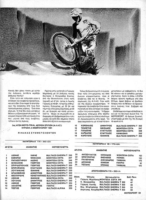 3ος ΑΓΩΝ MOTO-TRIALΑΣΠΡΩΝ ΣΠΙΤΙΩΝ (Α.Λ.Α.Σ.) ΚΥΡΙΑΚΗ, 8 ΦΕΒΡΟΥΑΡΙΟΥ 1981 ΠΙΝΑΚΑΣ ΣΥΜΜΕΤΕΧΟΝΤΩΝ |