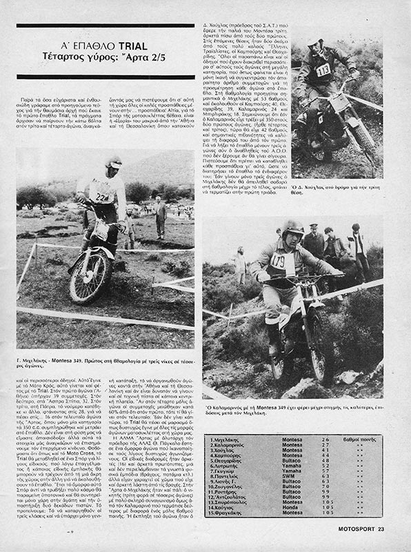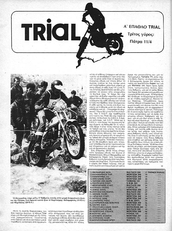 Παρά τα όσα ευχάριστα και ενθουσιώδη γράφαμε στο προηγούμενο τεύχος για την θαυμάσια αρχή πού έκανε το πρώτο έπαθλο Trial, τα πράγματα άρχισαν να παίρνουν την κάτω βόλτα στον τρίτο και τέταρτο αγώνα, αναγκάζοντάς μας να πιστέψουμε ότι σ' αυτή τη χώρα όλες οι καλές προσπάθειες μένουν στην ... προσπάθεια! Αιτία, για το Σπορ τής μοτοσικλέτας βέβαια, είναι ή «εξορία» του μακριά οπό την Αθήνα και τη Θεσσαλονίκη όπου κατοικούν και οι περισσότεροι οδηγοί. Αυτό έγινε με το Μότο Κρός, αυτό γίνεται και φέτος με το Trial. Στον πρώτο αγώνα (Αθήνα) υπήρχαν 39 συμμετοχές. Στον δεύτερο, στα Άσπρα Σπίτια, 32. Στον τρίτο, στη Πάτρα, το νούμερο κατέβηκε κι άλλο, φτάνοντας στις 28, για να πέσει στις... 16 στον τελευταίο αγώνα τής Άρτας, όπου μόνο μία κατηγορία τα 350 c.c. συμπληρώθηκε και μετράει στο έπαθλο.