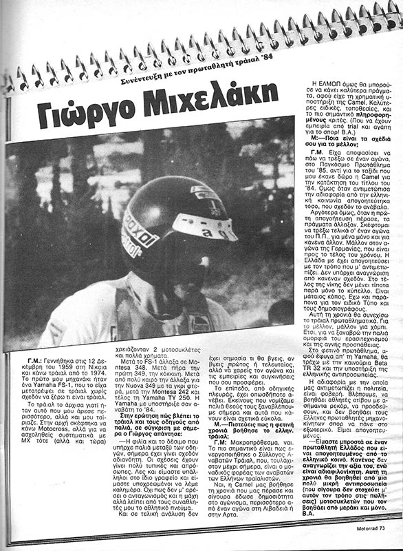 Συνέντευξη με τον πρωταθλητή τράιαλ '84 Γιώργο Μιχελάκη. Περιοδικό MOTORAD, τεύχος 21, Μάιος 1985.